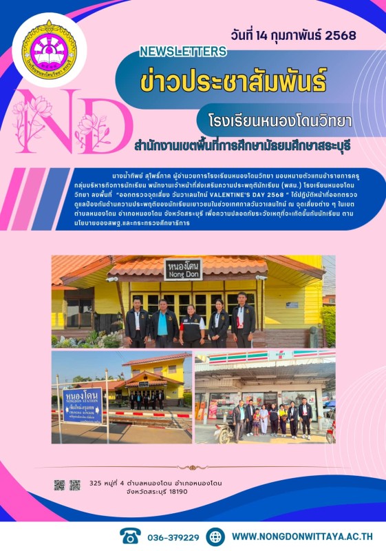 วันที่ 14 กุมภาพันธ์ 2568 นางน้ำทิพย์ สุโพธิ์ภาค ผู้อำนวยการโรงเรียนหนองโดนวิทยา มอบหมายตัวแทนข้าราชการครู กลุ่มบริหารกิจการนักเรียน พนักงานเจ้าหน้าที่ส่งเสริมความประพฤตินักเรียน (พสน.) โรงเรียนหนองโดนวิทยา ลงพื้นที่ “ออกตรวจจุดเสี่ยง วันวาเลนไทน์ Valenti
