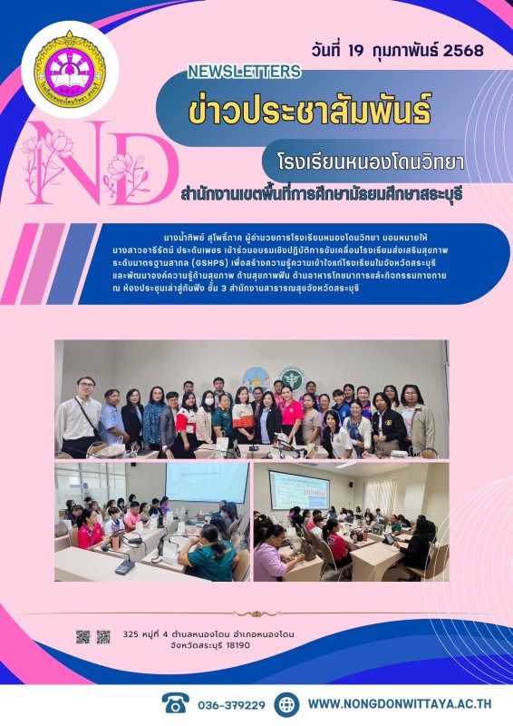 วันที่ 19 กุมภาพันธ์ 2568 นางน้ำทิพย์ สุโพธิ์ภาค ผู้อำนวยการโรงเรียนหนองโดนวิทยา มอบหมายให้ นางสาวอารีรัตน์ ประดับเพชร เข้าร่วมอบรมเชิงปฏิบัติการขับเคลื่อนโรงเรียนส่งเสริมสุขภาพ ระดับมาตรฐานสากล (GSHPS) เพื่อสร้างความรู้ความเข้าใจแก่โรงเรียนในจังหวัดสระบุ