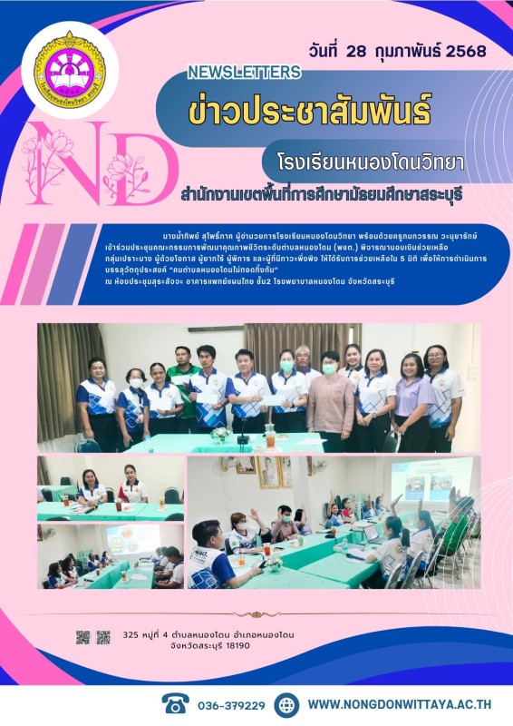 วันที่ 28 กุมภาพันธ์ 2568 นางน้ำทิพย์ สุโพธิ์ภาค ผู้อำนวยการโรงเรียนหนองโดนวิทยา พร้อมด้วยครูกนกวรรณ วะนุยารักษ์ เข้าร่วมประชุมคณะกรรมการพัฒนาคุณภาพชีวิตระดับตำบลหนองโดน (พชต.) พิจารณามอบเงินช่วยเหลือ กลุ่มเปราะบาง ผู้ด้วยโอกาส ผู้ยากไร้ ผู้พิการ และผู้ที