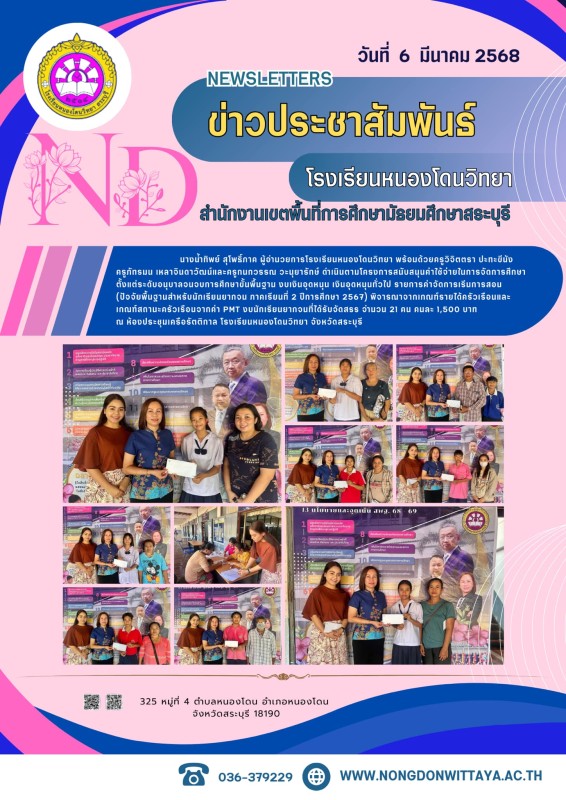 วันที่ 6 มีนาคม 2568 นางน้ำทิพย์ สุโพธิ์ภาค ผู้อำนวยการโรงเรียนหนองโดนวิทยา พร้อมด้วยครูวิจิตตรา ปะทะขีนัง ครูภัทรมน เหลาจินดาวัฒน์และครูกนกวรรณ วะนุยารักษ์ ดำเนินตามโครงการสนับสนุนค่าใช้จ่ายในการจัดการศึกษาตั้งแต่ระดับอนุบาลจนจบการศึกษาขั้นพื้นฐาน งบเงิน