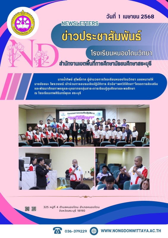 วันที่ 1 เมษายน 2568 นางน้ำทิพย์ สุโพธิ์ภาค ผู้อำนวยการโรงเรียนหนองโดนวิทยา มอบหมายให้ นายชัยชนะ ไพรวรรณ์ เข้าร่วมการอบรมเชิงปฏิบัติการ หัวข้อ”เพศวิถีศึกษา”โครงการส่งเสริมและพัฒนาศักยภาพครูและบุคลากรกลุ่มสาระการเรียนรู้สุขศึกษาและพลศึกษา ณ โรงเรียนเทพศิริ