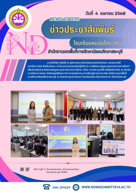 วันที่ 4 เมษายน 2568 นางน้ำทิพย์ สุโพธิ์ภาค ผู้อำนวยการโรงเรียนหนองโดนวิทยา มอบหมายให้ นางลัดดาวัลย์ พัวพันวัฒนะ เข้าร่วมการอบรมเชิงปฏิบัติการ การพัฒนาครูและบุคลากรทางการศึกษาเพื่อส่งเสริม และศักยภาพครูและบุคลากรทางการศึกษา เรื่อง การประยุกต์ใช้ Generativ