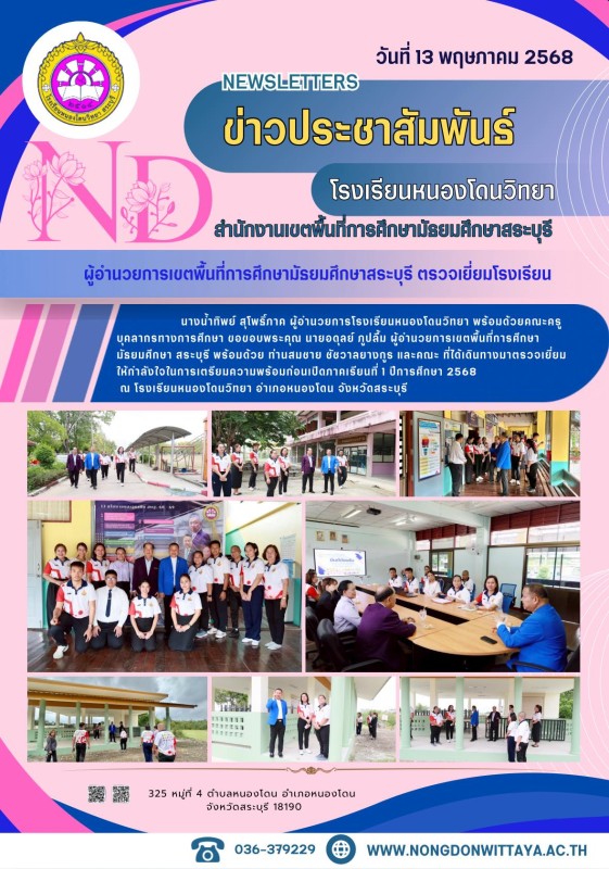วันที่ 13 พฤษภาคม 2568 นางน้ำทิพย์ สุโพธิ์ภาค ผู้อำนวยการโรงเรียนหนองโดนวิทยา พร้อมด้วยคณะครู บุคลากรทางการศึกษา ขอขอบพระคุณ นายอดุลย์ ภูปลื้ม ผู้อำนวยการเขตพื้นที่การศึกษามัธยมศึกษา สระบุรี พร้อมด้วย ท่านสมชาย ชัชวาลยางกูร และคณะ ที่ได้เดินทางมาตรวจเยี่ย