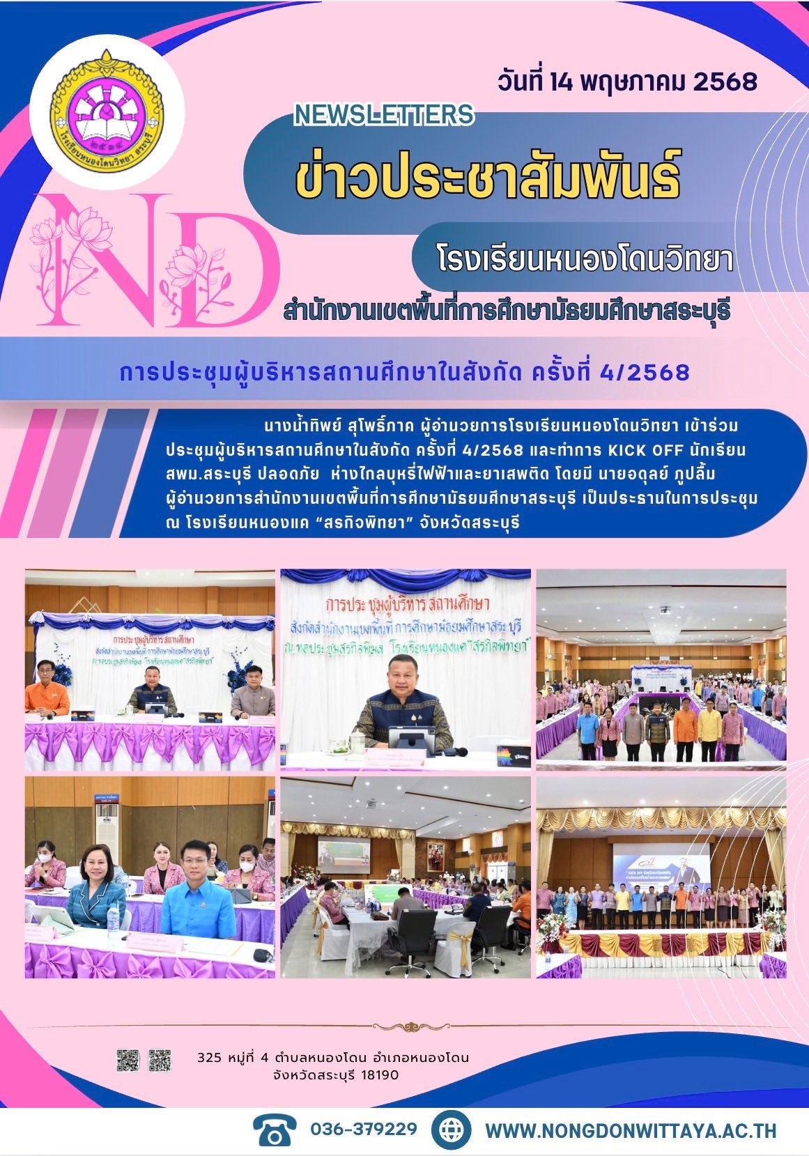 วันที่ 14 พฤษภาคม 2568 นางน้ำทิพย์ สุโพธิ์ภาค ผู้อำนวยการโรงเรียนหนองโดนวิทยา เข้าร่วมประชุมผู้บริหารสถานศึกษาในสังกัด ครั้งที่ 4/2568 และทำการ KICK OFF นักเรียน สพม.สระบุรี ปลอดภัย ห่างไกลบุหรี่ไฟฟ้าและยาเสพติด โดยมี นายอดุลย์ ภูปลื้ม ผู้อำนวยการสำนักงาน