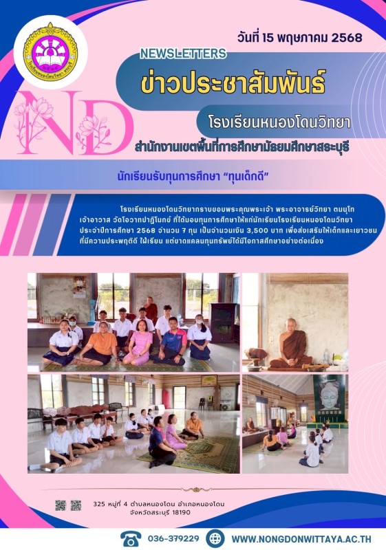 วันที่ 15 พฤษภาคม 2568 โรงเรียนหนองโดนวิทยากราบขอบพระคุณพระเจ้า พระอาจารย์วิทยา ตมนุโท เจ้าอาวาส วัดโอวาทปาฏิโมกข์ ที่ได้มอบทุนการศึกษา “ทุนเด็กดี” ให้แก่นักเรียนโรงเรียนหนองโดนวิทยา ประจำปีการศึกษา 2568 จำนวน 7 ทุน เป็นจำนวนเงิน 3,500 บาท เพื่อส่งเสริมให