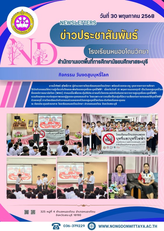 วันที่ 30 พฤษภาคม 2568 นางน้ำทิพย์ สุโพธิ์ภาค ผู้อำนวยการโรงเรียนหนองโดนวิทยา พร้อมด้วยคณะครู บุคลากรทางการศึกษา ได้จัดกิจกรรมให้ความรู้เกี่ยวกับโทษและพิษภัยของบุหรี่และบุหรี่ไฟฟ้า เนื่องในวันที่ 31 พฤษภาคมของทุกปี เป็นวันงดสูบบุหรี่โลก ซึ่งองค์การอนามัยโ