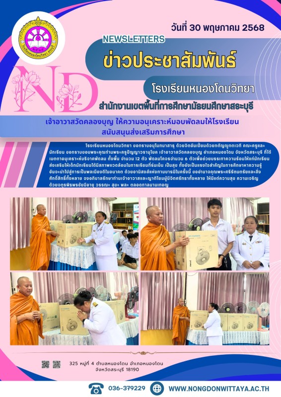 วันที่ 30 พฤษภาคม 2568 โรงเรียนหนองโดนวิทยา ขอกราบอนุโมทนาสาธุ ด้วยจิตอันเปี่ยมด้วยกตัญญูกตเวที คณะครูและนักเรียน ขอกราบขอบพระคุณท่านพระครูปัญญาวรานุโยค เจ้าอาวาสวัดคลองบุญ อำเภอหนองโดน จังหวัดสระบุรี ที่ได้เมตตาอนุเคราะห์บริจาคพัดลม ตั้งพื้น จำนวน 12 ตัว