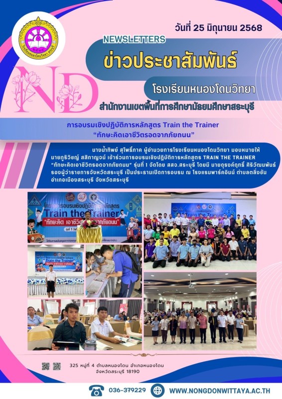 วันที่ 26 มิถุนายน 2568 นางน้ำทิพย์ สุโพธิ์ภาค ผู้อำนวยการโรงเรียนหนองโดนวิทยา มอบหมายให้ นายภูริวิชญ์ สสิกาญจน์ เข้าร่วมการอบรมเชิงปฏิบัติการหลักสูตร Train the Trainer “ทักษะคิดเอาชีวิตรอดจากภัยถนน” รุ่นที่ 1 จัดโดย สสจ.สระบุรี โดยมี นายดุรงค์ฤทธิ์ ศิริว