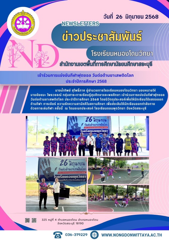 วันที่ 26 มิถุนายน 2568 นางน้ำทิพย์ สุโพธิ์ภาค ผู้อำนวยการโรงเรียนหนองโดนวิทยา มอบหมายให้ นายชัยชนะ ไพรวรรณ์ กลุ่มสาระการเรียนรู้สุขศึกษาและพลศึกษา เข้าร่วมการแข่งขันกีฬาฟุตซอลวันต่อต้านยาเสพติดโลก ประจำปีการศึกษา 2568 โดยมีวัตถุประสงค์เพื่อให้นักเรียนได้