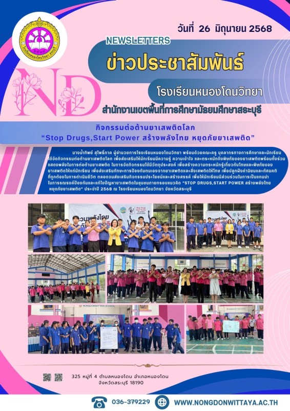 วันที่ 26 มิถุนายน 2568 นางน้ำทิพย์ สุโพธิ์ภาค ผู้อำนวยการโรงเรียนหนองโดนวิทยา พร้อมด้วยคณะครู บุคลากรทางการศึกษาและนักเรียน ได้จัดกิจกรรมต่อต้านยาเสพติดโลก เพื่อส่งเสริมให้นักเรียนมีความรู้ ความเข้าใจ และตระหนักถึงพิษภัยของยาเสพติดพร้อมทั้งร่วมแสดงพลังใน