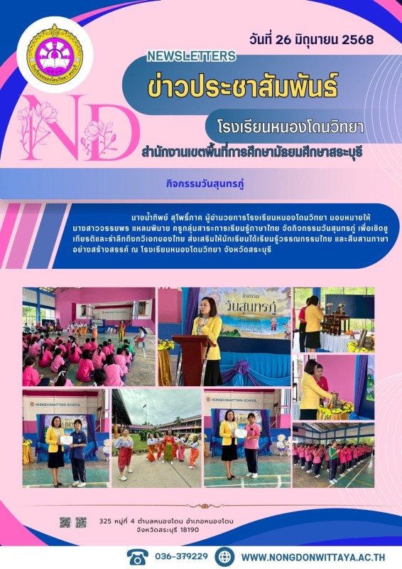 วันที่ 26 มิถุนายน 2568 นางน้ำทิพย์ สุโพธิ์ภาค ผู้อำนวยการโรงเรียนหนองโดนวิทยา มอบหมายให้นางสาวจรรยพร แหลมพิมาย ครูกลุ่มสาระการเรียนรู้ภาษาไทย จัดกิจกรรมวันสุนทรภู่ เพื่อเชิดชูเกียรติและรำลึกถึงกวีเอกของไทย ส่งเสริมให้นักเรียนได้เรียนรู้วรรณกรรมไทย และสืบ