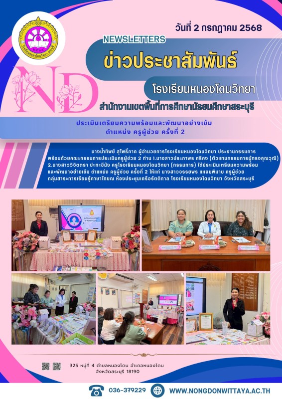 วันที่ 2 กรกฎาคม 2568 นางน้ำทิพย์ สุโพธิ์ภาค ผู้อำนวยการโรงเรียนหนองโดนวิทยา ประธานกรรมการ พร้อมด้วยคณะกรรมการประเมินครูผู้ช่วย 2 ท่าน 1.นางสาวประภาพร ศรีคง (ตัวแทนกรรมการผู้ทรงคุณวุฒิ) 2.นางสาววิจิตตรา ปะทะขีนัง ครูโรงเรียนหนองโดนวิทยา (กรรมการ) ได้ประเม