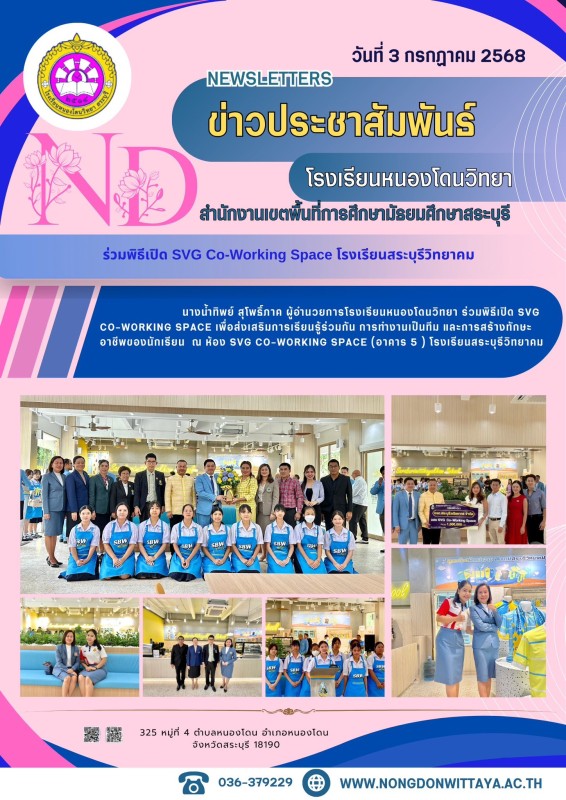 วันที่ 3 กรกฎาคม 2568 นางน้ำทิพย์ สุโพธิ์ภาค ผู้อำนวยการโรงเรียนหนองโดนวิทยา ร่วมพิธีเปิด SVG Co-Working Space เพื่อส่งเสริมการเรียนรู้ร่วมกัน การทำงานเป็นทีม และการสร้างทักษะอาชีพของนักเรียน ณ ห้อง SVG Co-Working Space (อาคาร 5 ) โรงเรียนสระบุรีวิทยาคม