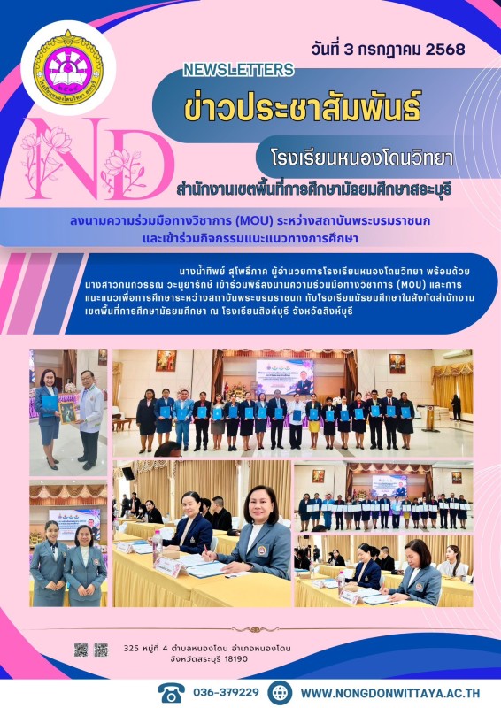 วันที่ 3 กรกฎาคม 2568 นางน้ำทิพย์ สุโพธิ์ภาค ผู้อำนวยการโรงเรียนหนองโดนวิทยา พร้อมด้วยนางสาวกนกวรรณ วะนุยารักษ์ เข้าร่วมพิธีลงนามความร่วมมือทางวิชาการ (MOU) และการแนะแนวเพื่อการศึกษาระหว่างสถาบันพระบรมราชนก กับโรงเรียนมัธยมศึกษาในสังกัดสำนักงานเขตพื้นที่ก
