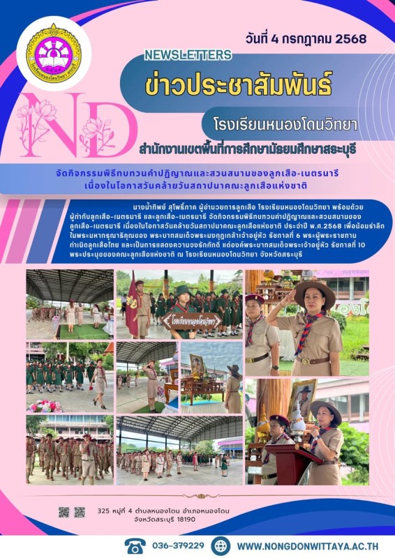 วันที่ 4 กรกฎาคม 2568 นางน้ำทิพย์ สุโพธิ์ภาค ผู้อำนวยการลูกเสือ โรงเรียนหนองโดนวิทยา พร้อมด้วยผู้กำกับลูกเสือ-เนตรนารี และลูกเสือ-เนตรนารี จัดกิจกรรมพิธีทบทวนคำปฏิญาณและสวนสนามของลูกเสือ-เนตรนารี เนื่องในโอกาสวันคล้ายวันสถาปนาคณะลูกเสือแห่งชาติ ประจำปี พ.