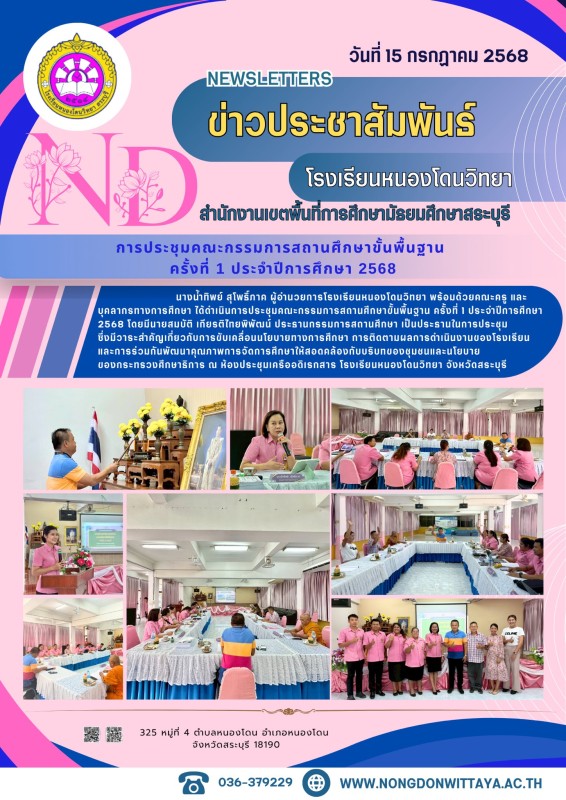วันที่ 15 กรกฎาคม 2568 นางน้ำทิพย์ สุโพธิ์ภาค ผู้อำนวยการโรงเรียนหนองโดนวิทยา พร้อมด้วยคณะครู และบุคลากรทางการศึกษา ได้ดำเนินการประชุมคณะกรรมการสถานศึกษาขั้นพื้นฐาน ครั้งที่ 1 ประจำปีการศึกษา 2568 โดยมีนายสมบัติ เกียรติไทยพิพัฒน์ ประธานกรรมการสถานศึกษา เป