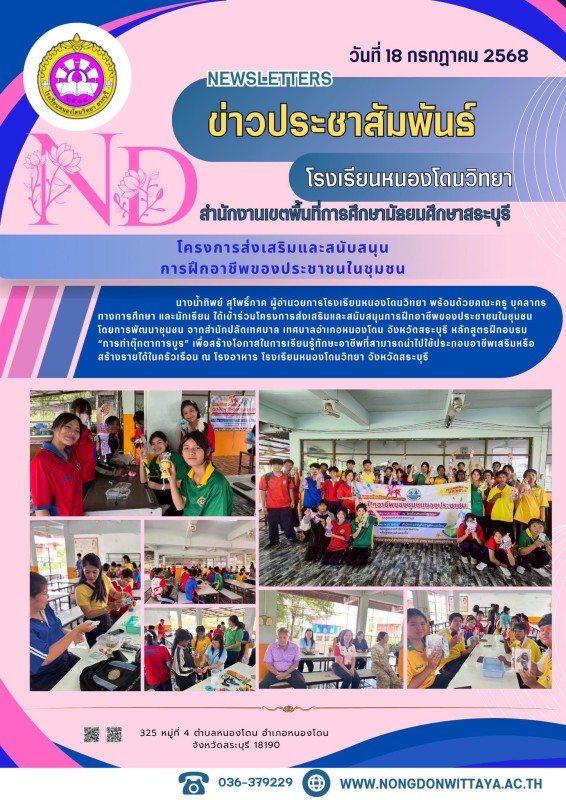 วันที่ 18 กรกฎาคม 2568 นางน้ำทิพย์ สุโพธิ์ภาค ผู้อำนวยการโรงเรียนหนองโดนวิทยา พร้อมด้วยคณะครู บุคลากรทางการศึกษา และนักเรียน ได้เข้าร่วมโครงการส่งเสริมและสนับสนุนการฝึกอาชีพของประชาชนในชุมชน โดยการพัฒนาชุมชน จากสำนักปลัดเทศบาล เทศบาลอำเภอหนองโดน จังหวัดสร