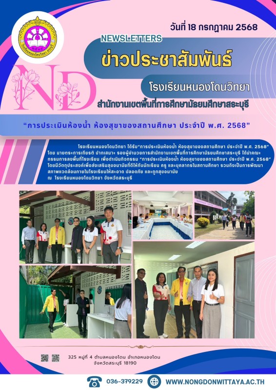วันที่ 18 กรกฎาคม 2568 โรงเรียนหนองโดนวิทยา ได้รับ“การประเมินห้องน้ำ ห้องสุขาของสถานศึกษา ประจำปี พ.ศ. 2568” โดย นายตระการเกียรติ ปากเสนาะ รองผู้อำนวยการสำนักงานเขตพื้นที่การศึกษามัธยมศึกษาสระบุรี ได้นำคณะกรรมการลงพื้นที่โรงเรียน เพื่อดำเนินกิจกรรม “การปร