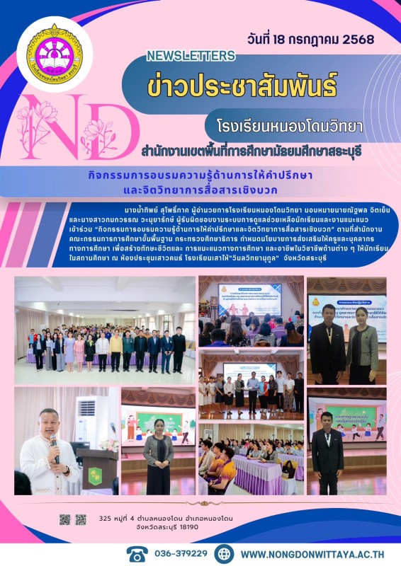 วันที่ 18 กรกฎาคม 2568 นางน้ำทิพย์ สุโพธิ์ภาค ผู้อำนวยการโรงเรียนหนองโดนวิทยา มอบหมายนายณัฐพล จิตเย็น และนางสาวกนกวรรณ วะนุยารักษ์ ผู้รับผิดชอบงานระบบการดูแลช่วยเหลือนักเรียนและงานแนะแนว เข้าร่วม “กิจกรรมการอบรมความรู้ด้านการให้คำปรึกษาและจิตวิทยาการสื่อส