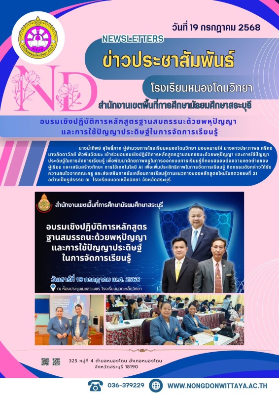 วันที่ 19 กรกฎาคม 2568 นางน้ำทิพย์ สุโพธิ์ภาค ผู้อำนวยการโรงเรียนหนองโดนวิทยา มอบหมายให้ นางสาวประภาพร ศรีคง และ นางลัดดาวัลย์ พัวพันวัฒนะ เข้าร่วมอบรมเชิงปฏิบัติการหลักสูตรฐานสมถรรนะด้วยพหุปัญญา และการใช้ปัญญาประดิษฐ์ในการจัดการเรียนรู้ เพื่อพัฒนาศักยภาพ