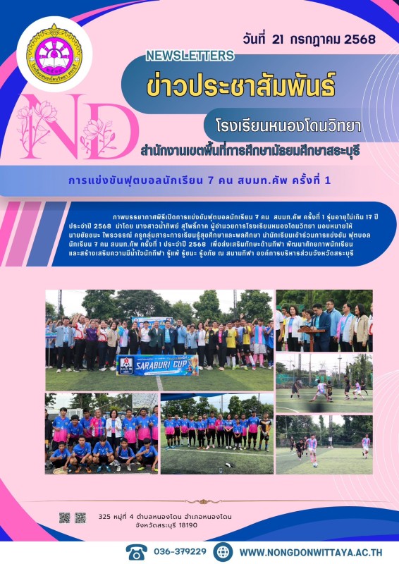 วันที่ 21 กรกฎาคม 2568 ภาพบรรยากาศพิธีเปิดการแข่งขันฟุตบอลนักเรียน 7 คน สบมท.คัพ ครั้งที่ 1 รุ่นอายุไม่เกิน 17 ปี ประจำปี 2568 นำโดย นางสาวน้ำทิพย์ สุโพธิ์ภาค ผู้อำนวยการโรงเรียนหนองโดนวิทยา มอบหมายให้ นายชัยชนะ ไพรวรรณ์ ครูกลุ่มสาระการเรียนรู้สุขศึกษาและ