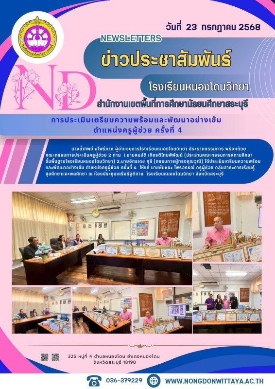 วันที่ 23 กรกฎาคม 2568 นางน้ำทิพย์ สุโพธิ์ภาค ผู้อำนวยการโรงเรียนหนองโดนวิทยา ประธานกรรมการ พร้อมด้วย คณะกรรมการประเมินครูผู้ช่วย 2 ท่าน 1.นายสมบัติ เกียรติไทยพิพัฒน์ (ประธานคณะกรรมการสถานศึกษา ขั้นพื้นฐานโรงเรียนหนองโดนวิทยา) 2.นายอิทธเดช คุลี (กรรมการผู