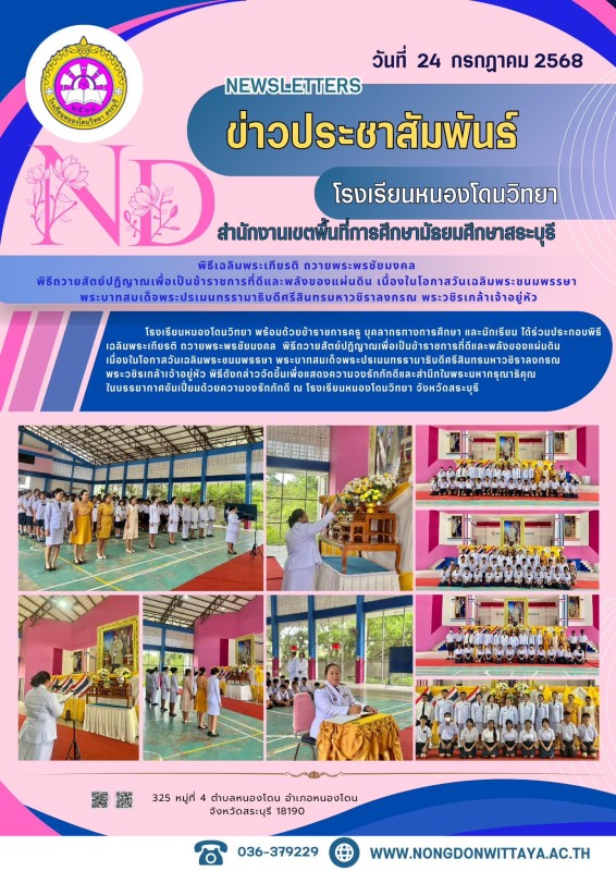 วันที่ 24 กรกฎาคม 2568 โรงเรียนหนองโดนวิทยา พร้อมด้วยข้าราชการครู บุคลากรทางการศึกษา และนักเรียน ได้ร่วมประกอบพิธีเฉลิมพระเกียรติ ถวายพระพรชัยมงคล พิธีถวายสัตย์ปฏิญาณเพื่อเป็นข้าราชการที่ดีและพลังของแผ่นดิน เนื่องในโอกาสวันเฉลิมพระชนมพรรษา พระบาทสมเด็จพระ