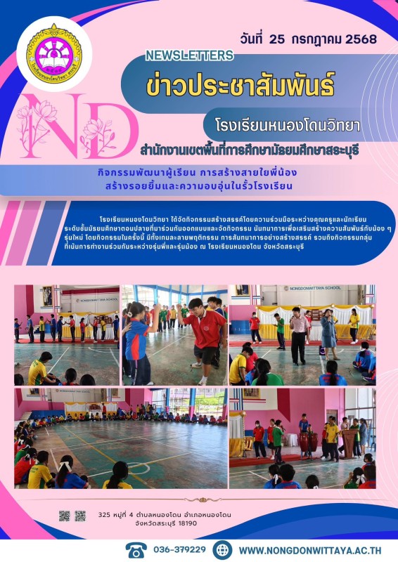 วันที่ 25 กรกฎาคม 2568 โรงเรียนหนองโดนวิทยา ได้จัดกิจกรรมสร้างสรรค์โดยความร่วมมือระหว่างคุณครูและนักเรียน ระดับชั้นมัธยมศึกษาตอนปลายที่มาร่วมกันออกแบบและจัดกิจกรรม นันทนาการเพื่อเสริมสร้างความสัมพันธ์กับน้อง ๆ รุ่นใหม่ โดยกิจกรรมในครั้งนี้ มีทั้งเกมละลายพ