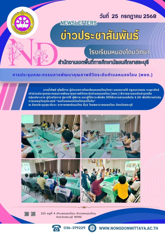 วันที่ 25 กรกฎาคม 2568 นางน้ำทิพย์ สุโพธิ์ภาค ผู้อำนวยการโรงเรียนหนองโดนวิทยา มอบหมายให้ ครูกนกวรรณ วะนุยารักษ์ เข้าร่วมประชุมคณะกรรมการพัฒนาคุณภาพชีวิตระดับตำบลหนองโดน (พชต.) พิจารณามอบเงินช่วยเหลือ กลุ่มเปราะบาง ผู้ด้วยโอกาส ผู้ยากไร้ ผู้พิการ และผู้ที่