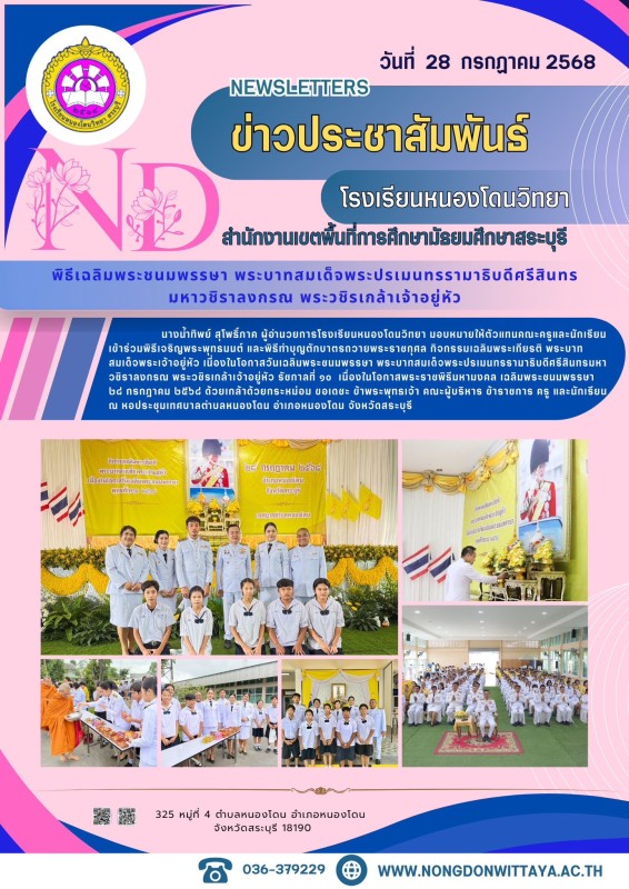 วันที่ 28 กรกฎาคม 2568 นางน้ำทิพย์ สุโพธิ์ภาค ผู้อำนวยการโรงเรียนหนองโดนวิทยา มอบหมายให้ตัวแทนคณะครูและนักเรียน เข้าร่วมพิธีเจริญพระพุทธมนต์ และพิธีทำบุญตักบาตรถวายพระราชกุศล กิจกรรมเฉลิมพระเกียรติ พระบาทสมเด็จพระเจ้าอยู่หัว เนื่องในโอกาสวันเฉลิมพระชนมพรร