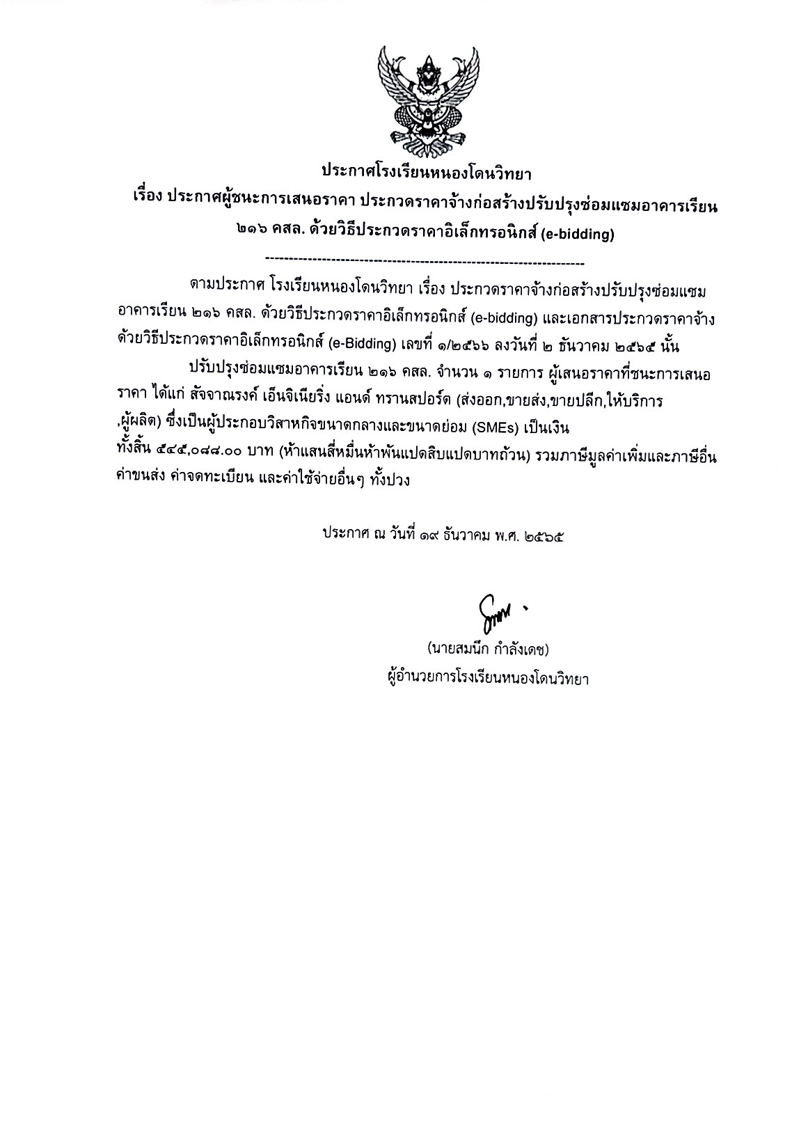 ประกาศผู้ชนะการเสนอราคา ประกวดราคาจ้างก่อสร้างปรับปรุงซ่อมแซมอาคารเรียน 216 คสล. ด้วยวิธีประกวดราคาอิเล็กทรอนิกส์ (e-bidding)