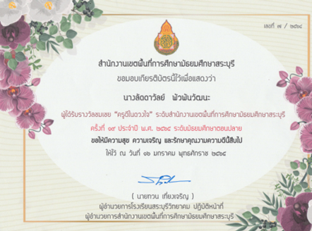 ชื่อผลงาน : รางวัลชมเชย “ครูดีในดวงใจ” ระดับสำนักงานเขตพื้นที่การศึกษามัธยมศึกษาสระบุรี ครั้งที่ 19 ประจำปี พ.ศ. ๒๕๖4 ระดับมัธยมศึกษาตอนปลาย