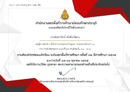 ชื่อผลงาน : ครูผู้ฝึกสอนนักเรียน ได้รับรางวัลระดับเหรียญทอง รองชนะเลิศอันดับ 4 การแข่งขันจัดสวนถาด (แบบชื้น) ระดับมัธยมชั้น ม.1 - ม.3 งานศิลปหัตถกรรมนักเรียน ระดับเขตพื้นที่การศึกษา ครั้งที่ 70 ปีการศึกษา 2565