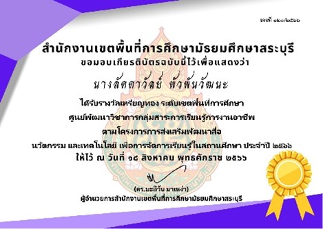 ชื่อผลงาน : รางวัลระดับเหรียญทอง ระดับเขตพื้นที่การศึกษา ศูนย์พัฒนาวิชาการกลุ่มสาระการเรียนรู้การงานอาชีพ ตามโครงการส่งเสริมพัฒนาสื่อ นวัตกรรม และเทคโนโลยี เพื่อการจัดการเรียนรู้ในสถานศึกษา ประจำปี 2566
