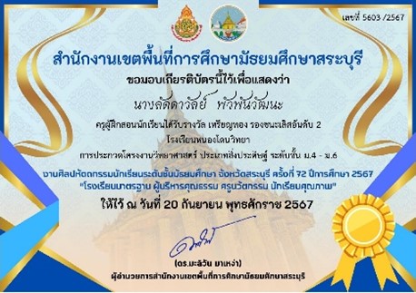 ชื่อผลงาน : ครูผู้ฝึกสอนนักเรียนได้รับรางวัล เหรียญทอง รองชนะเลิศอันดับ 2 การประกวดโครงงานวิทยาศาสตร์ ประเภทสิ่งประดิษฐ์ ระดับชั้น ม.4 -ม.6 งานศิลปหัตถกรรมนักเรียน ระดับชั้นมัธยมศึกษา จังหวัดสระบุรี ครั้งที่ 72 ปีการศึกษา 2567