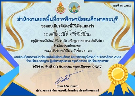 ชื่อผลงาน : ครูผู้ฝึกสอนนักเรียนได้รับรางวัล เหรียญทอง รองชนะเลิศอันดับ 2 การแข่งขันจักสานไม้ไผ่ ระดับชั้น ม.1 -ม.3 งานศิลปหัตถกรรมนักเรียน ระดับชั้นมัธยมศึกษา จังหวัดสระบุรี ครั้งที่ 72 ปีการศึกษา 2567